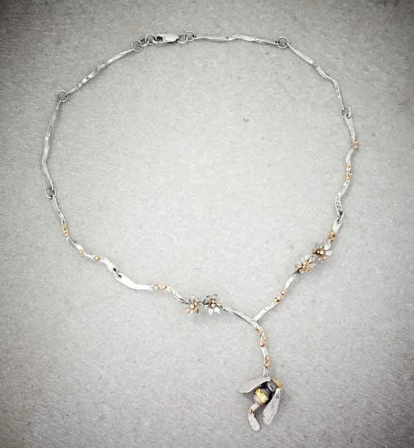 I made the bee in silver and 18ct yellow gold, sculpting in molten metal and then working on the top to add definition and detail, the necklace was created with silver twisty links, formed to look like the wood of a tree branch. The flowers were centred with 18ct granules of pollen, which also dotted around the rest of the necklace and the earrings.